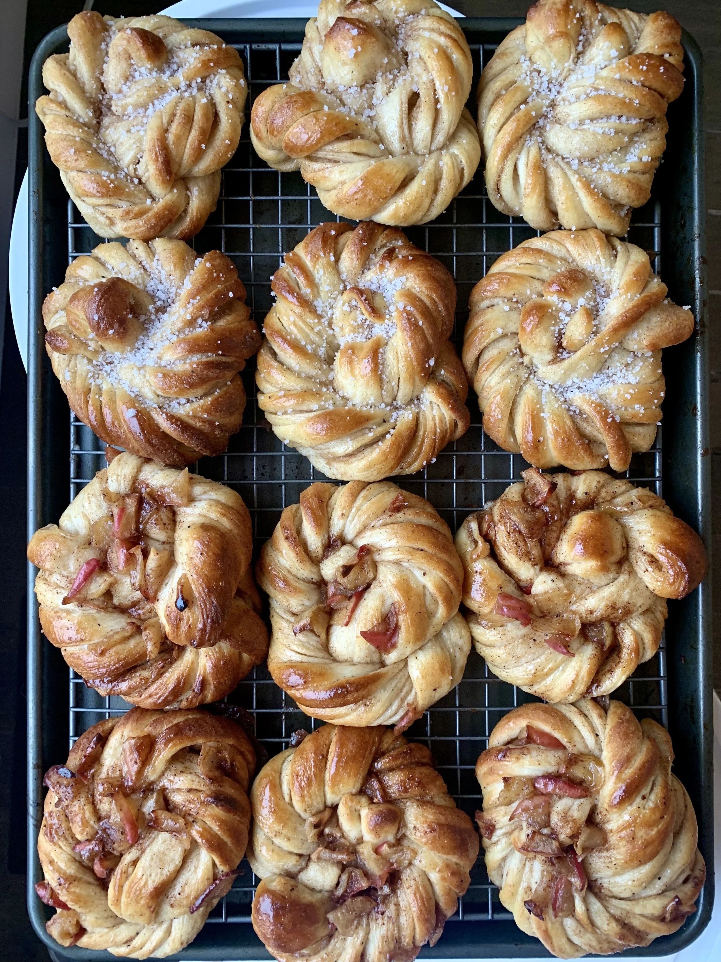 Garlic & fresh herb sourdough, Camembert & hot honey danishes, blueberry cream cheese danishes, leek & Gruyère cruffins, and strawberry lemon cruffins.