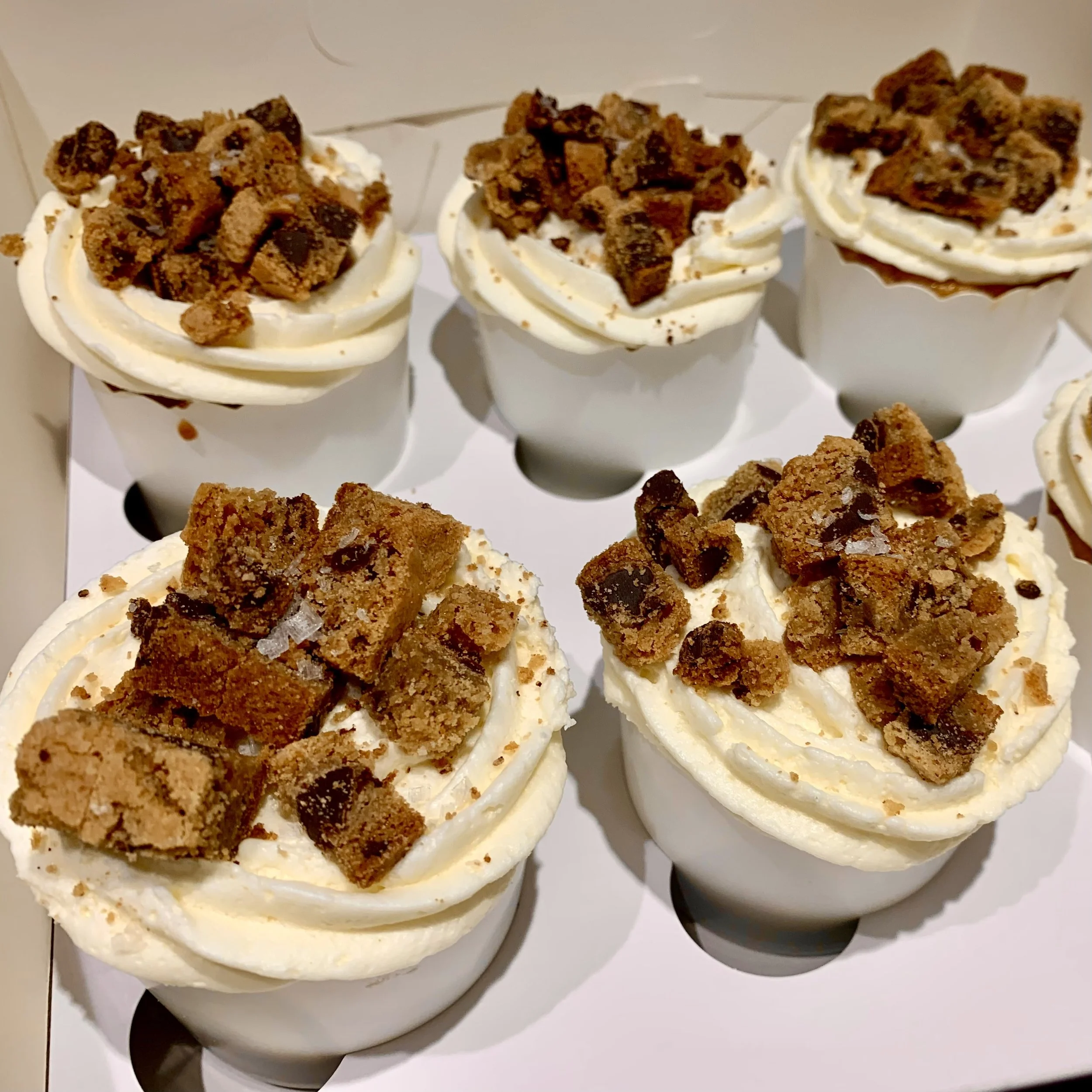 Our first foray into the world of cupcakes meets one of our all-time favourites — the sea salt chocolate chip cookie. Topped with vanilla icing, a crumble of our house-baked cookie, and a light sprinkle of sea salt for the perfect sweet-salty balance. Inside, you’ll find a surprise core of icing and chocolate chips piped into the centre. Soft, nostalgic, and completely irresistible.